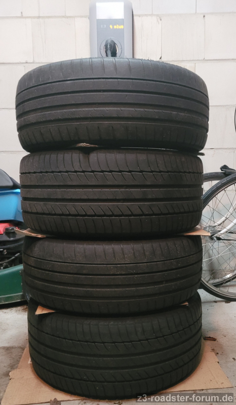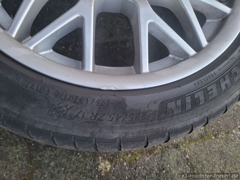 Es handelt sich um die Standard Mischbereifung 225/245 in 17“ ET 41 mit gebrauchten Michelin Pilot Sport und Primacy HP (DOT 1618/0820) und verdeckten Ventilen. Die Felgen haben leichte Gebrauchsspuren, 2 kleine Beschädigungen und sind nicht geputzt (siehe Bilder).
