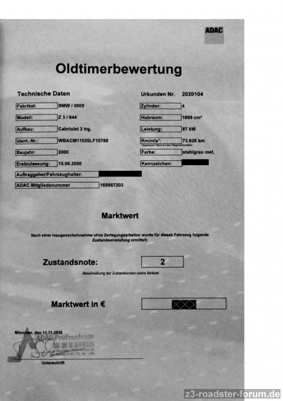 Wir müßen leider unseren Z3 1.9i 118 PS der uns seit Juni 2000 also 24 Jahre begleitet hat Altersbedingt Verkaufen. Da wir Erstbesitzer sind können wir die 74586 Km auf der Uhr Garantieren und er hat uns nie im stich gelassen. Letzter TÜV war 2023 im Juni und natürlich ohne Beanstandung. Das Fahrzeug hat im November 2020 ein Oldtimer Gutachten erhalten mit einem Guten Zustandswert von Note 2 und einem Marktwert in höhe von 12300€.