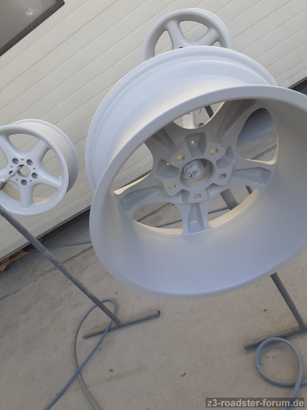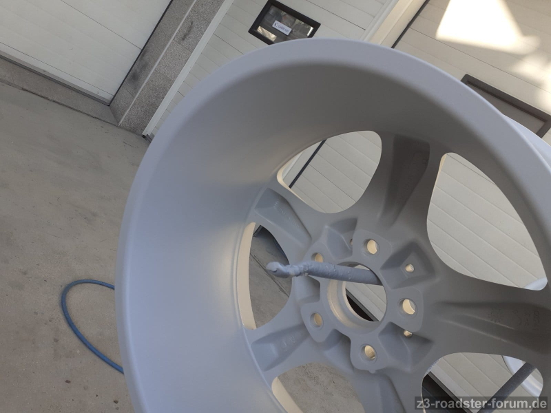 Die Felgen waren gebraucht mit paar überschaubaren Bordsteinkratzern. Dies kann man bei dem Alter auch nicht übel nehmen. Soeben sind die Felgen bei einer Meisterlackiererei abgegeben worden und ich habe eine vollständige Überholung angefordert. Die werden schleifen, grundieren / füllern, schleifen und anschließend in der Farbe "BMW B20 Decorsilber II Metallic" lackiert. Pulvern ist cool, das habe ich bei meinen anderen BMWs doch nichts kommt von dem Glanz an eine ordentliche Lackierung - daher habe ich diese Felgen lackieren lassen. Es wird die komplette Felge lackiert außer dem inneren "Felgenstern" der auf der Radnabe aufliegt.