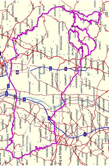 Wir fahren zuerst nach Sueden bis Selestat. Von dort aus nach Ste-Marie-aux-Mines. Anschliessend weiter auf dem Vogesenkamm ueber Col de la Schlucht , Grand Ballon bis nach Cernay. Vor hier aus ueber Thann, Masevaux zum Balon d' Alsace. Dann geht es wieder nach Norden. Ueber Col de la Schlucht, Munster und Turckheim nach Colmar. Von hier aus geht es weiter nach Norden ueber Riquewihr, Ribeauville, Kintzheim, Scherwiller, Dambach, Andlau bis Obernai und dann zurueck zum Ausgangspunkt.