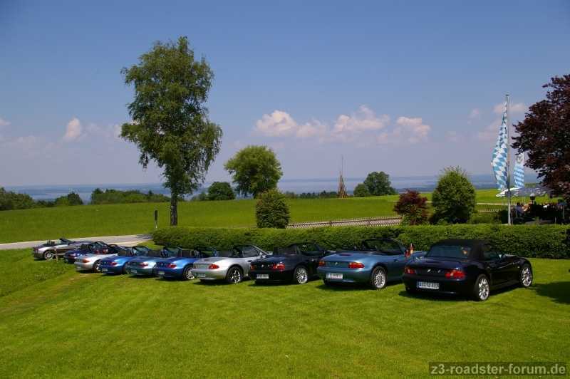 Nach unserem Treff bei McDoof in Burghausen fahren wir ab Seebruck eine halbe Schleife um den Chiemsee und wagen dann einen verspäteten Zetti-Almauftrieb. Wir haben heute aktuell gecheckt, ob die Wiese dort zum artgerechten Parken geeignet ist. Ist sie und man kann auch noch immer den ganzen Chiemsee überblicken.