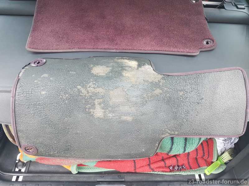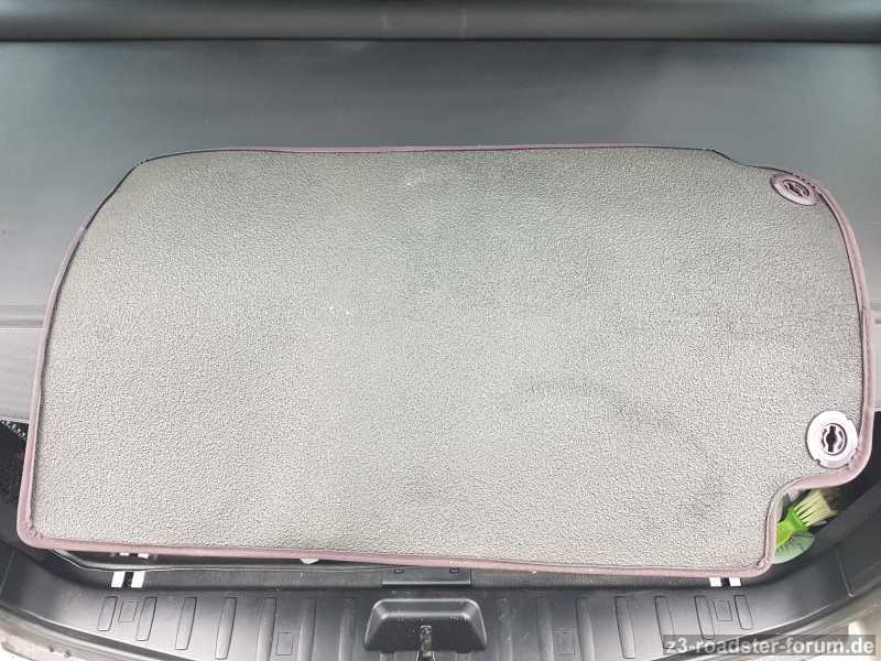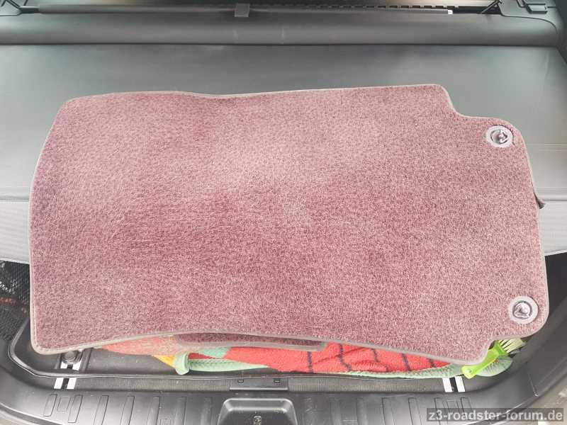 Die Befestigungskunststoffschrauben in violett sind ebenfalls dabei. Beide Fußmatten sind ohne Löcher und erkennbaren Abnutzungserscheinungen. Einzig eine Kedernaht sollte nachgenäht werden.