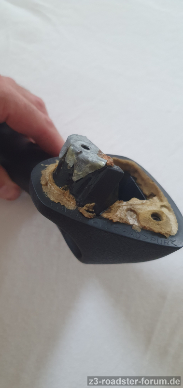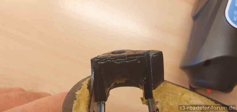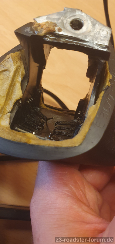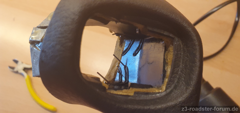 Vorgehen:- Plastik-Innenteil mit den Draht-Einsätzen und der Plastic Welding Gun verstärken; diese dann abclipsen und mindestens fahrerseitig abschleifen und vergießen, weil dies sonst das Kabel und Stecker für Spiegelverstellung beschädigt