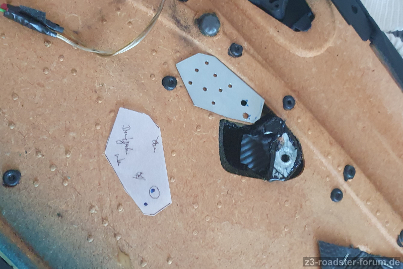 - Aus Blech ein Muster formen, was zusätzlich in die Türverkleidung klebt wird, durch zwei Löcher am Muster wird der Griff angeschraubt (Info: das Blech sitzt nicht am Türblech oder Türfolie (Baujahr 97) auf, da ist genug Platz