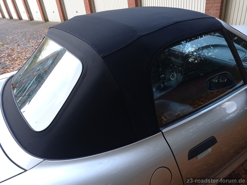 Ende Juli hat meiner ein neues blaues Verdeck mit Regenrinne und schickem Innenhimmel bekommen. Sehr netter Kontakt, sehr kompetente Arbeit mit einem tollen Ergebnis. Montagedauer ca. 6 Stunden. Ich durfte auch ein wenig mithelfen. Am Anfang geht das neue Verdeck sehr schwer zu (nichts für zarte Hände!), das hat sich aber bis jetzt gegeben und die benötigte Handkraft ist heute die gleiche wie beim alten Verdeck. Die Scheibe faltet sich anfänglich auch nicht immer wie gewünscht. Ich habe nach dem Aufklappen immer die Scheibe (natürlich mit Frotteetuch) in eine schöne Wulst gelegt und auftretende Knicke sofort korrigiert. Auch das hat sich mittlerweile erledigt, die Scheibe hat gelernt und legt sich heute von selber sauber ein.