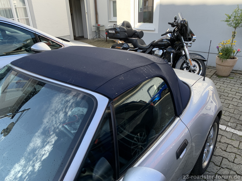 Ende Juli hat meiner ein neues blaues Verdeck mit Regenrinne und schickem Innenhimmel bekommen. Sehr netter Kontakt, sehr kompetente Arbeit mit einem tollen Ergebnis. Montagedauer ca. 6 Stunden. Ich durfte auch ein wenig mithelfen. Am Anfang geht das neue Verdeck sehr schwer zu (nichts für zarte Hände!), das hat sich aber bis jetzt gegeben und die benötigte Handkraft ist heute die gleiche wie beim alten Verdeck. Die Scheibe faltet sich anfänglich auch nicht immer wie gewünscht. Ich habe nach dem Aufklappen immer die Scheibe (natürlich mit Frotteetuch) in eine schöne Wulst gelegt und auftretende Knicke sofort korrigiert. Auch das hat sich mittlerweile erledigt, die Scheibe hat gelernt und legt sich heute von selber sauber ein.