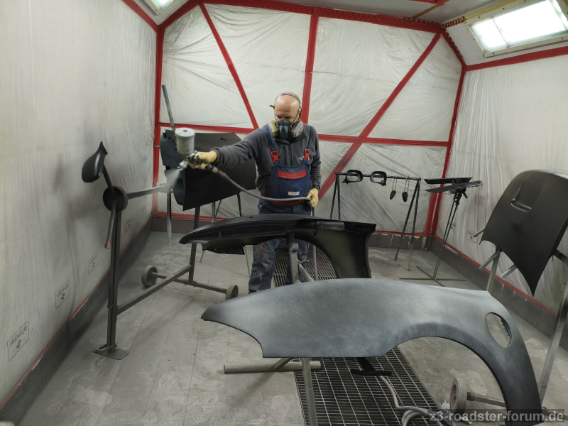 Morgen werden die Stoßstangen grundiert. Die hintere hatte wohl einen Riss der geflickt wurde. Anschließend kam Kunststoffspachtel drüber. Das trocknet bis morgen, wird plan geschliffen und grundiert dann.
