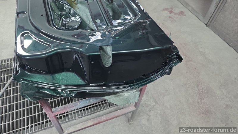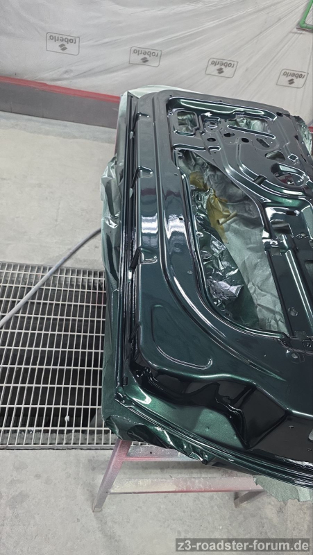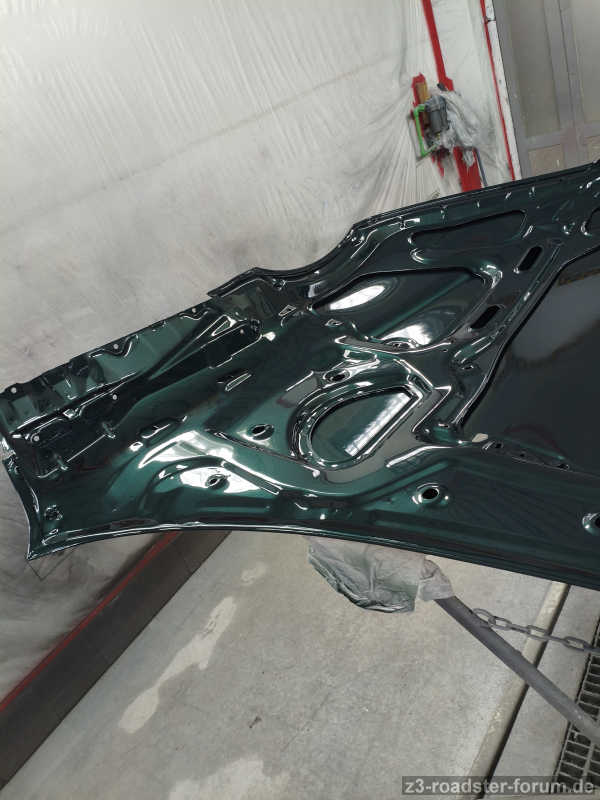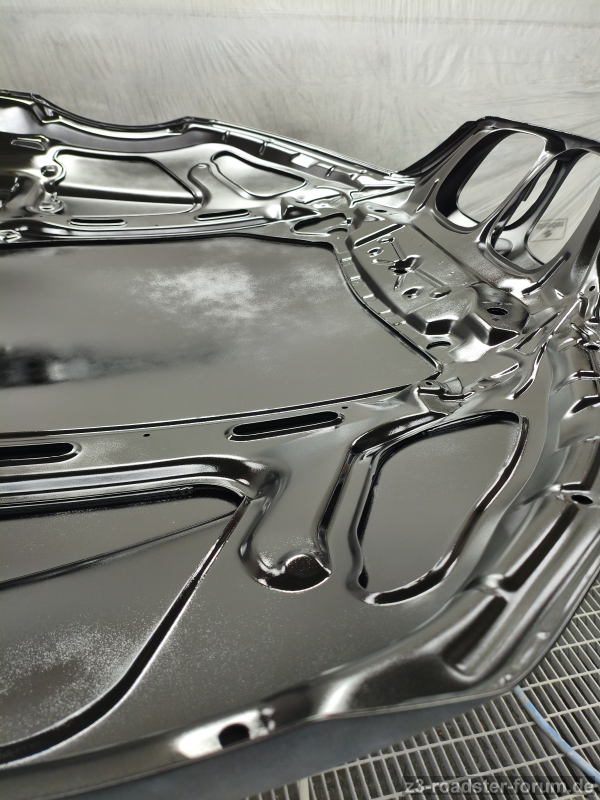 Die Motorhaube sollte heute innen fertig werden. Stundenlang geschliffen, und gereinigt. Ich glaube nur abgeblasen hat der Meister sie 15 min lang. Anschließend sagte er "lass sie uns waschen". Das habe ich verneint mit dem Gedanken an Rost der sich bilden wird.
