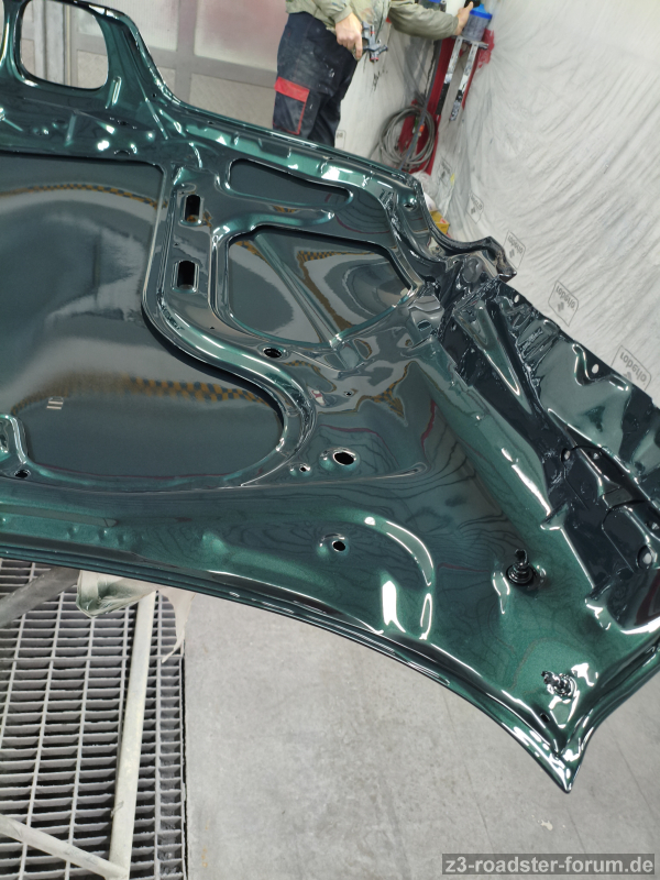 Irgendwo in den Pfalzen der Haube war wohl Staub drinnen. Die ganze Haube war plötzlich bedeckt von den kleinen Pickeln. Die Lackierung wurde abgebrochen.