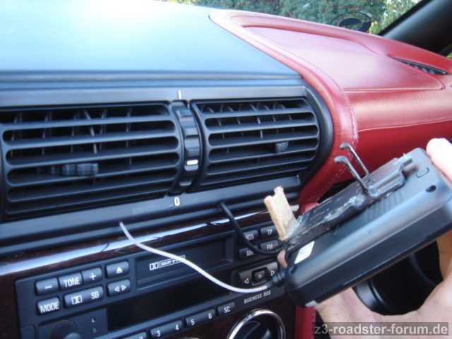 Die Stromzufuhr erfolgt duch ein kleines eingeschmolzenes Loch im Lüftungsgitter. Das Kabel führt hinter der Mittelkonsole an einen zusätzlich angebrachten Ein/Aus Schalter neben dem BC. Als Stromquelle wurde das Kabel zum Zigarrettenanzünder angezapft.