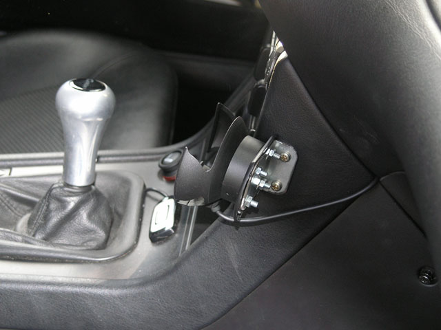 Der unschönste Teil der Aktion. Im Lieferumfang befindet sich die Cradle, die auf ihre Halterung montiert wird. Außer vier Schrauben für die Halterung und einer kleinen mit Klebepunkten besetzten Plastikplatte befindet sich kein Winkel oder dergleichen zur schönen Montage in der Box. Diese Sparlösung ermöglicht es wohl, bei einem größeren Cockpit, die Plastikplatte irgendwo festzukleben, nach dem man die Halterung dran geschraubt hat – beim Z3 natürlich nicht möglich. Also war ein wenig Feinarbeit angesagt. Im Obi habe ich einen Winkel gekauft und diesen entsprechend für das Auto bearbeitet. Also auf der einen Seite abgeflext, dass nur noch 2 Schrauben in die Armaturen gebohrt werden müssen, die für die Halterung entsprechenden Löcher reingebohrt und die Ecken abgerundet. Aufgrund fehlender Farbe ist mein Halter immer noch in der Metall-Farbe, es empfiehlt sich aber natürlich, den Winkel schwarz zu lackieren (oder einen schwarzen Winkel zu besorgen), obwohl es auch nicht sonderlich auffällt (zumindest von der Fahrerseite her, wo ich nun mal sitze). Auf den Winkel habe ich dann die schwarze Platte angebracht und dann die Cradle drauf verschraubt. Das ganze an der rechten Seite der Mittelkonsole angebracht. Das Kabel des Ice>Link verschwindet jetzt zwischen Handschuhfach und Konsole Richtung Radio – dafür musste natürlich (wieder mal ;) ) das Handschuhfach ausgebaut werden.